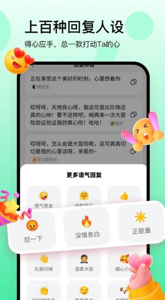 回复神器app下载是一款聊天辅助软件,它可以帮助用户快速提升自己的聊天技巧,不论是恋爱对话,聊天话题还是土味情话,可以帮助用户在各种互动表现中表现出更高的情商,还有很多内置场景和数百个聊天角色模型,能够满足不同用户的使用需求,各种实用的聊天话术帮你轻松追到自己喜欢的女生,遇到各种不会回复的话题都可以在这里寻找答案,功能非常全面,帮你轻松应对各种场景,完全不用担心没有恋爱经验或不会聊天,如果你也喜欢这款软件的话,软件站现有最新版本,那就快来下载吧。