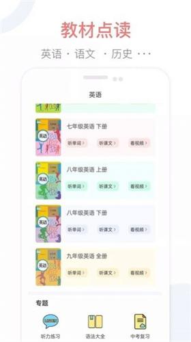 1、掌上初中下载涵盖了英语、语文、历史等科目,有声教材可以随时的进行朗读,让学习背诵更高效。