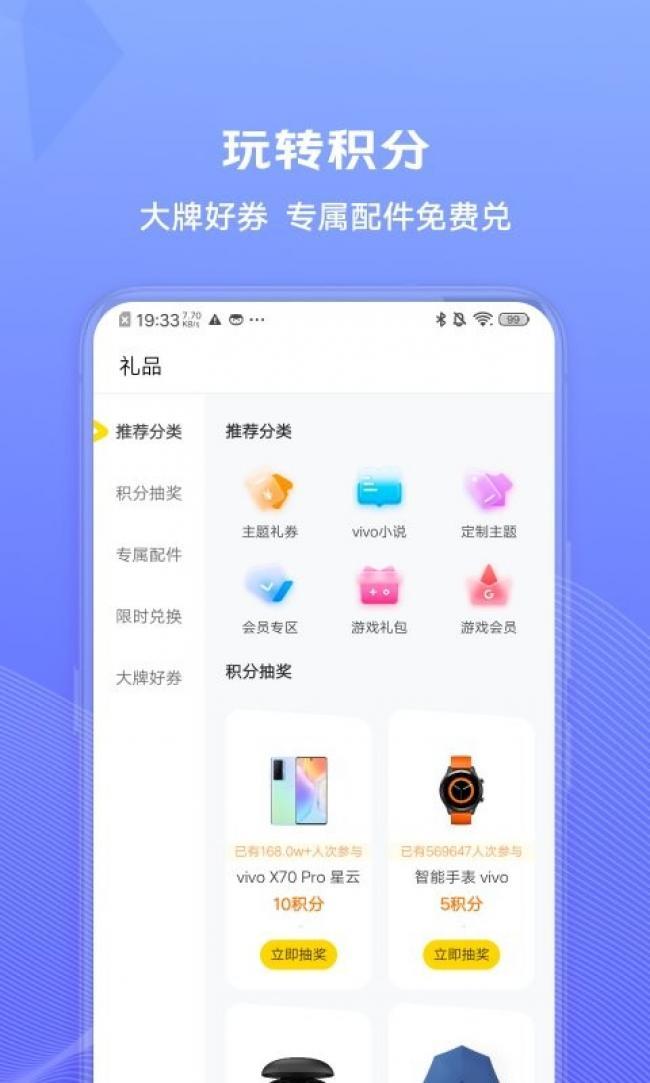 我的vivo下载是一款专门为vivo手机用户打造的便捷软件,其中会为用户提供许多的功能,包括特权福利、优质内容、趣味活动等让用户可以更好的使用这款手机,还能在上面查看自己的信息,查看自己的使用情况。在这里你可以免费领取到购物、生活娱乐、游戏等礼包,还能签到或者参加各种活动来获取积分,所有的积分都可以当做现金来花哦,在其中购买商品都可以进行抵扣,还可以兑换各种小礼品,让你不用花一分钱就能带回家,还有许多的实用工具来等你探索。喜欢的伙伴们快来下载试试吧。