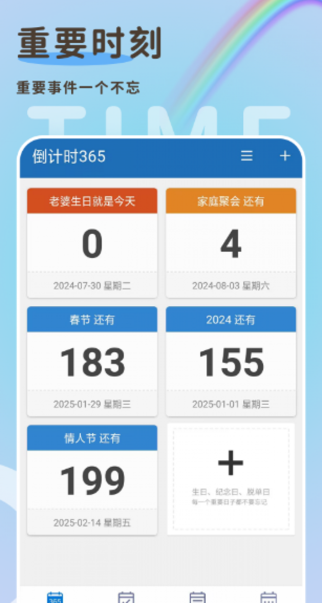 倒计时365软件下载是一款为用户提供独特日子计时提醒功能的软件,帮助用户不会忘记特殊日子,在这里你可以设置独特的倒计时日历,有多种倒计时界面供你选择,你还可以在其中设置自己喜欢的背景。并且通过独特的时间任务计划安排便捷器,让你可以快速的添加所需要记住的事件,而且一次性可以创建多个计划内容,让你可以轻松的实现时间上的管理,当计划临近的时候会对你进行提醒,以免你忘记,不管是工作、生活还是学习上的事情,都可以在这做出时间规划。喜欢的伙伴们快来下载试试吧。