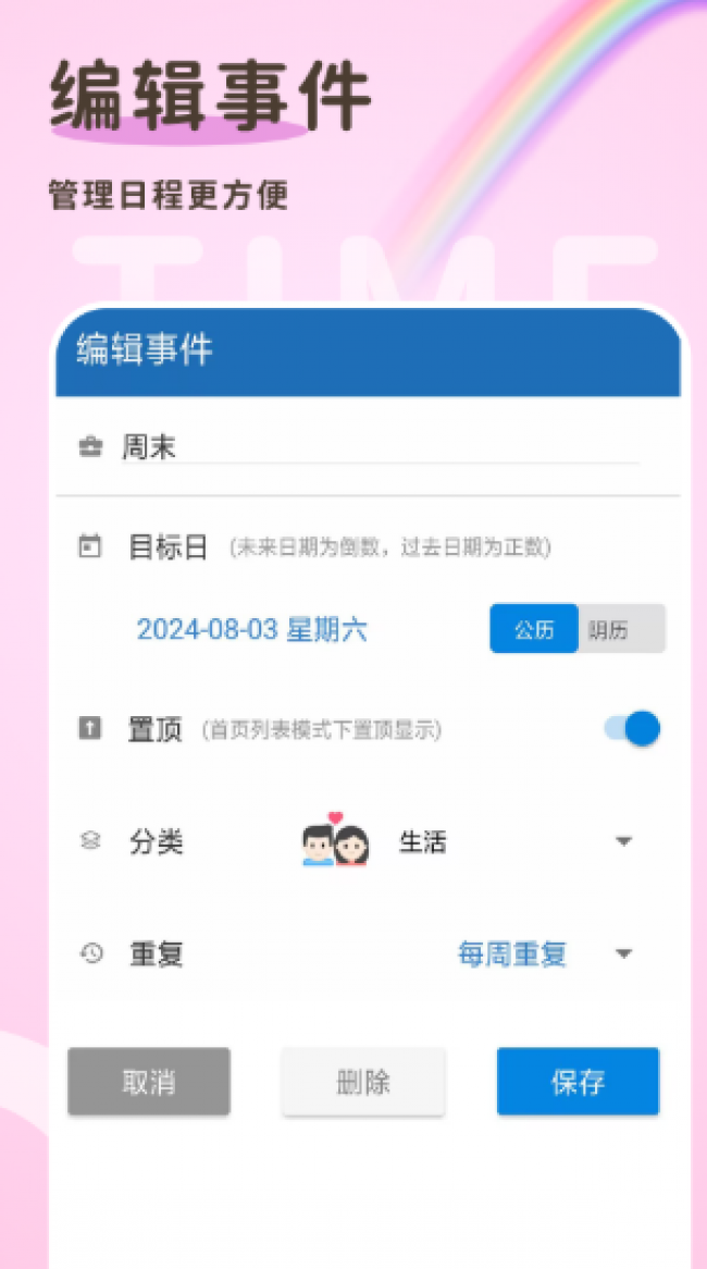 1、以后管理自己添加的倒计时就会更轻松,让你获得更便捷的管理体验;