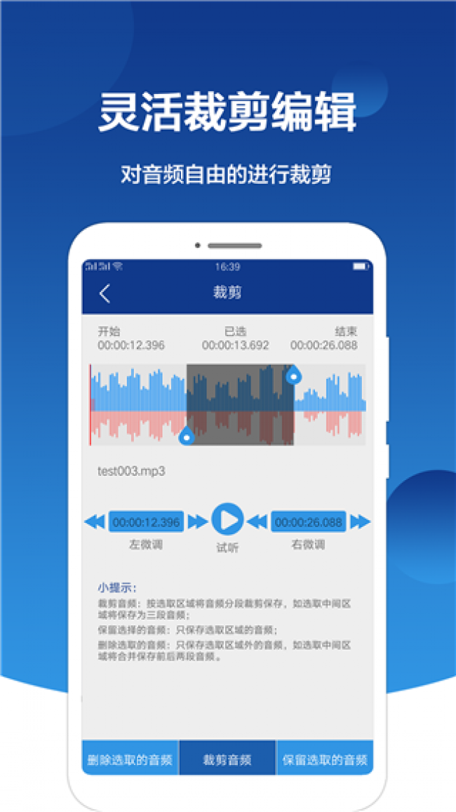 2、可以自由的对音频内容进行微调的裁剪获取你需要的音频片段