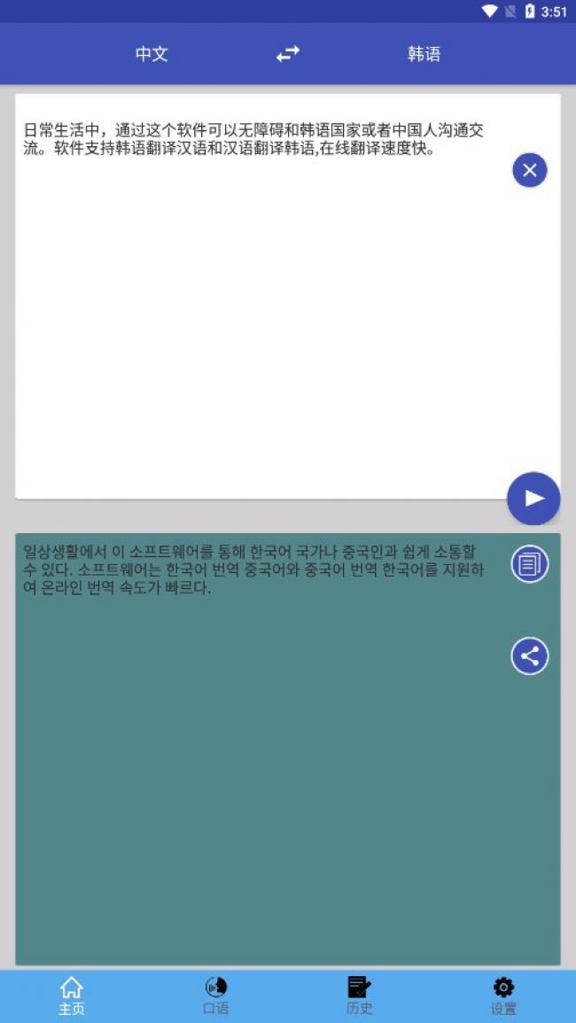 2、支持分享翻译的内容,可以将翻译的结果分享,一起学习中文和韩语;