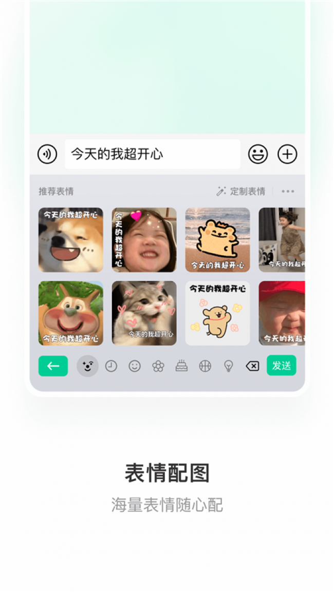 1、微信输入法app下载安装支持表情联想输入功能,文字输入后自动推荐相关微信表情和emoji表情。