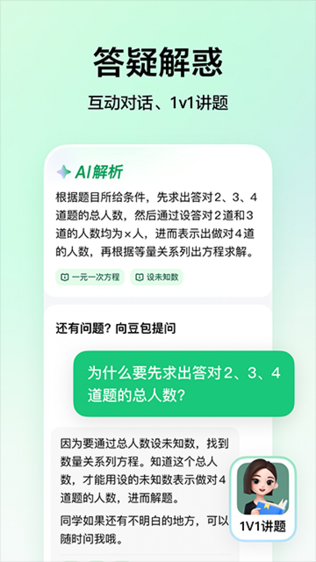 豆包爱学app官方正版下载是一款非常好用的智能ai学习助手,它可以帮助用户轻松解决各种难题,支持拍题解答、作业批改和作文辅导等功能,可以为用户的日常学习带来很多帮助,非常适合中小学生使用,通过ai识别和智能分析技术,大大提高用户的学习效率,帮你轻松应对各种问题,为用户提供详细的答题思路,让你可以更好的理解每一道题目的逻辑,还可以为你的作文进行润色,帮你提升自己的文采,写出更优质的作文,如果你也喜欢这款软件的话,软件站现有最新版本,那就快来下载吧。