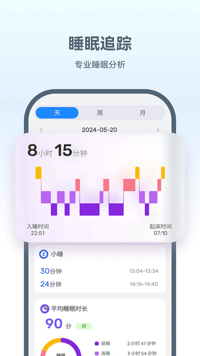 3、图文展示每天的睡眠情况,给予睡眠评分与贴心建议,并统计每周、每月的睡眠趋势。