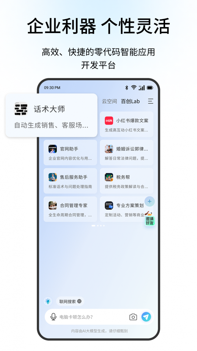 3、在百创Lab功能中可以利用AI智能技术自动生成各种销售、客服场景的营销话术使用。