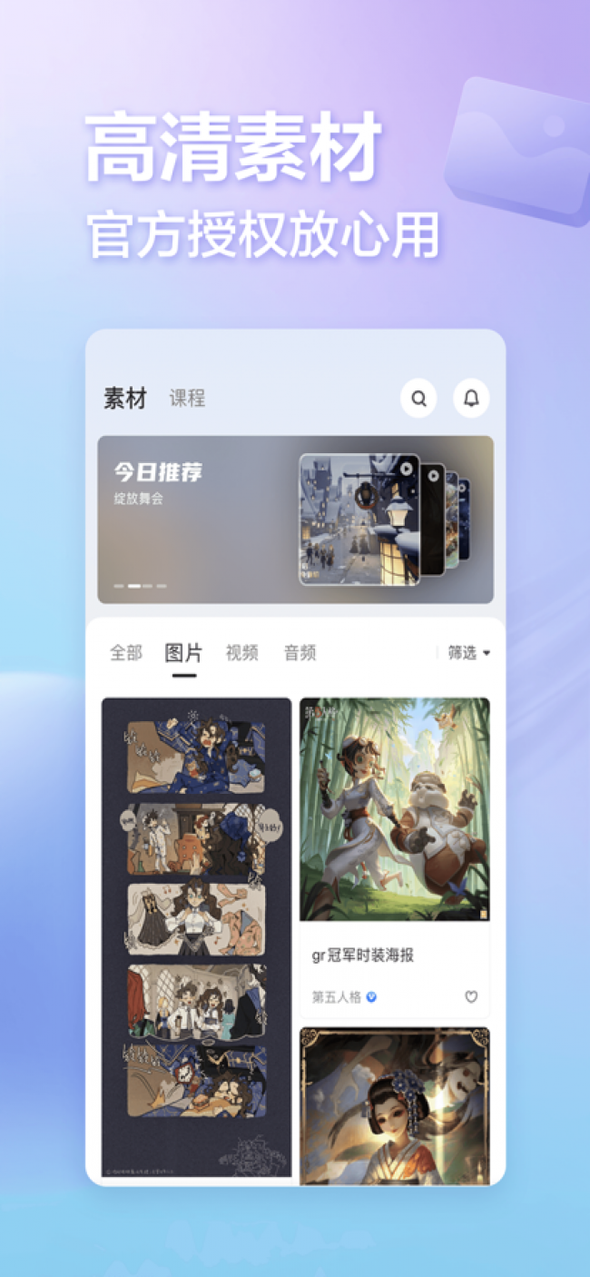 3、创作者可以免费获取视频CG、美术原画、无损音频等官方精品授权素材,还可以上传分享个人原创素材。