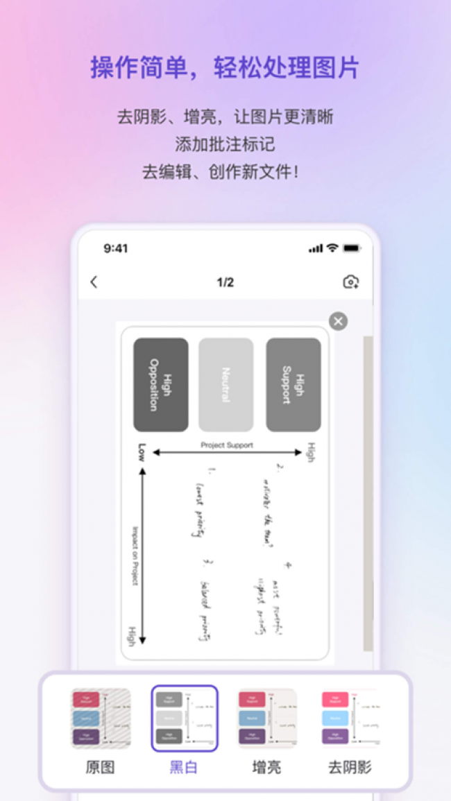1、通过手机相机拍摄纸质文档,并自动识别边界和裁剪图像,确保扫描结果清晰。