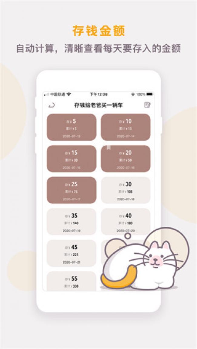1、根据存钱需求自由选择存钱模式,自动生成每天要存入的金额,已完成的存钱计划可归档查看。
