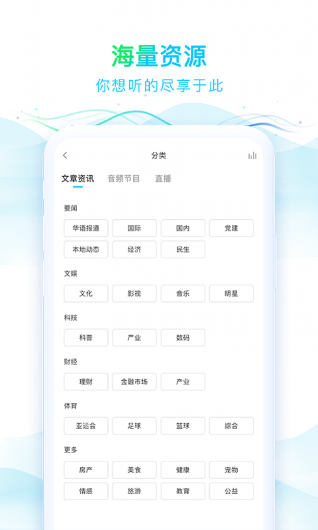 华语之声app下载是一款专业的有声电台软件,能够为用户提供海量的电台资源,用户可以尽情的收听各种自己喜欢的内容,其中覆盖了文娱类、生活类、知识类等多种不同的种类,用户可以根据自己的喜欢自由选择收听,并且还拥有搜索功能,通过关键词的搜索可以帮助你快速找到想要的内容,非常的方便,同时还可以将自己喜欢听的电台频道进行收藏,方便下次打开继续收听,通过它你可以快速的获取各种最新的新闻资讯,一键点播随时随地打开想听就听。喜欢的伙伴们快来下载试试吧。