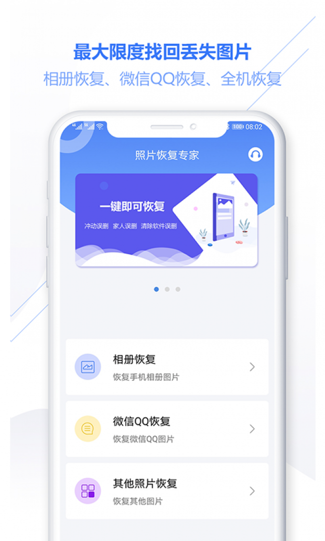 1、简单实用的主页功能列表,这里设置了相册恢复、微信和QQ恢复以及其他照片恢复功能。