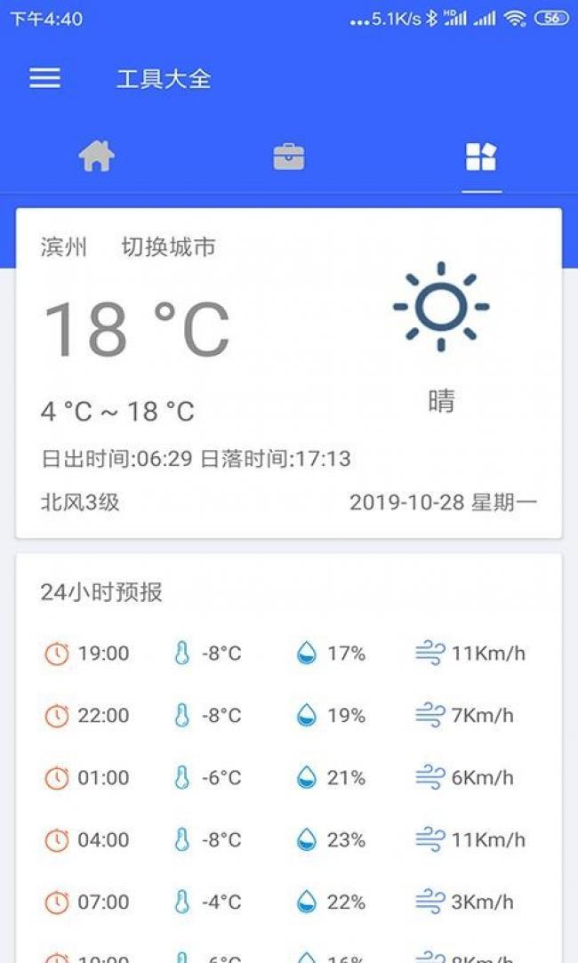 3、为用户提供各个小时的降水量和风力,还可以看到每天的日出和日落时间。