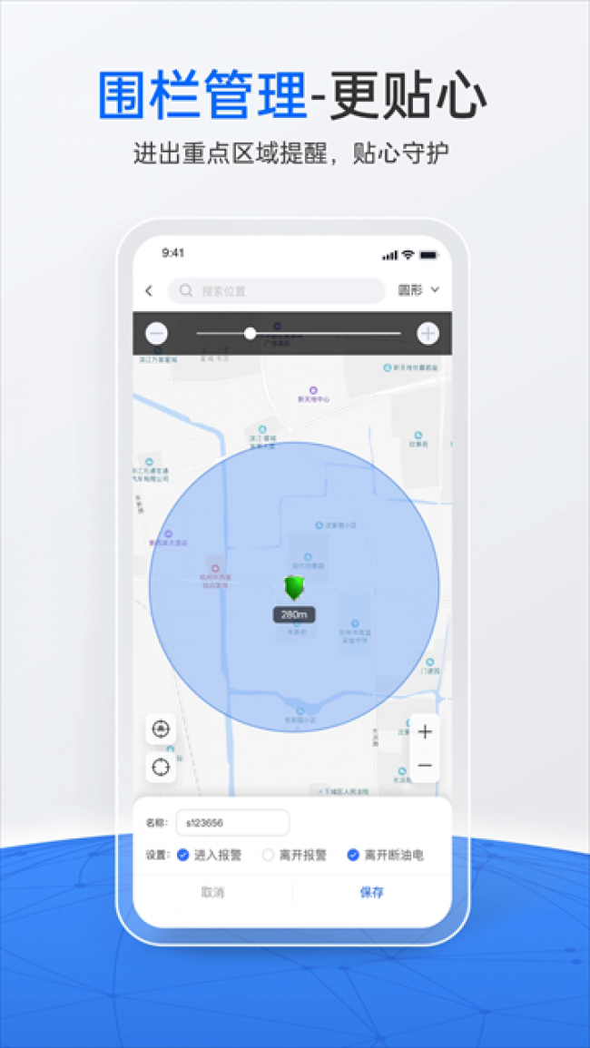 2、多种自由形式围栏限制车辆行驶区域,车辆进入/离开限定区域触发报警。