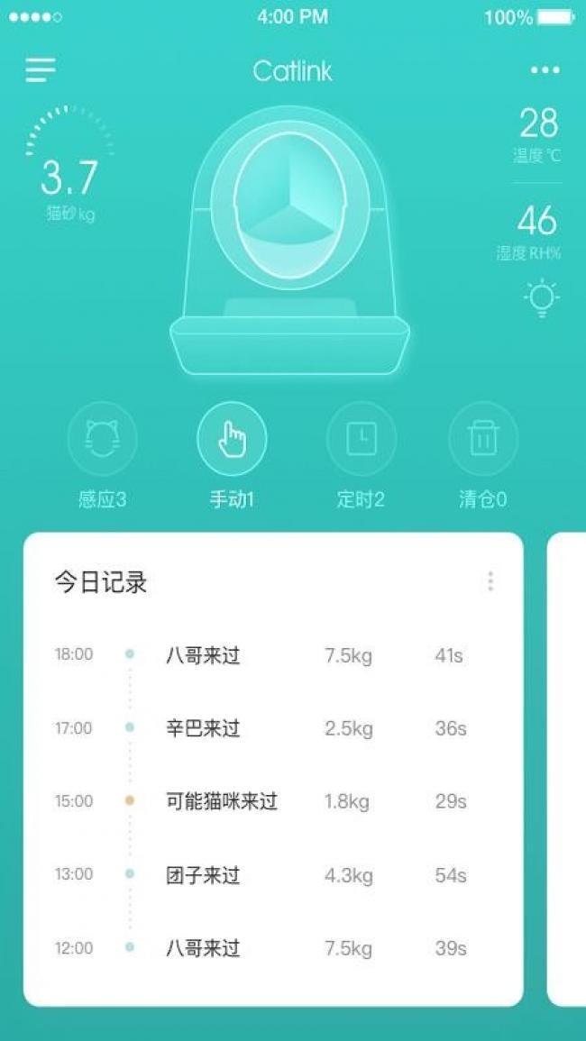3、用户可以随时随地了解猫厕所环境信息,设备信息等;App及时推送提醒,例如猫砂余量不足、集便仓满等,更具人性化.