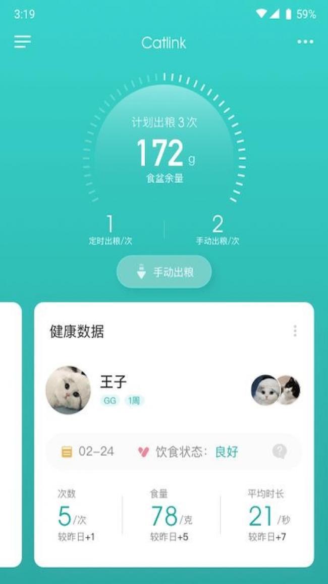 1、CATLINK官方下载为用户详细显示自己猫咪较昨日的进食次数、食量和平均时长变化信息;