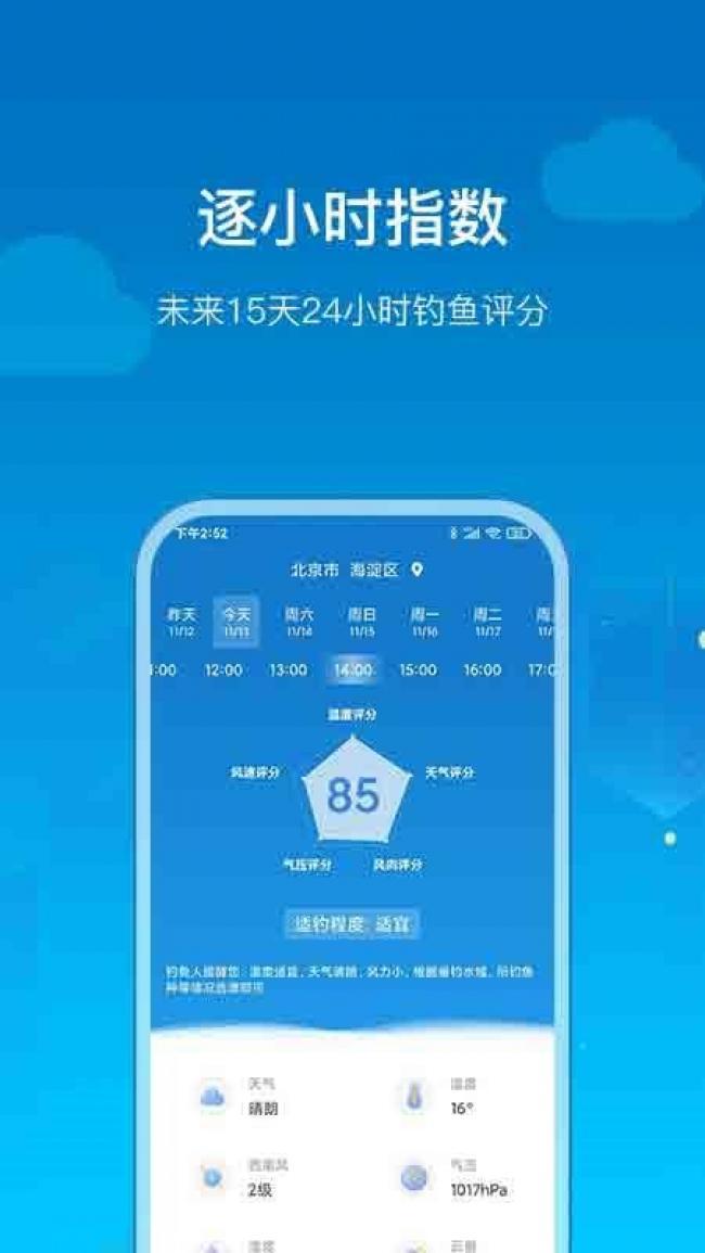 3、根据天气、温度、气压、风力风向等综合因素计算出的逐小时钓鱼指数,未来15天任意时间段的钓鱼天气一览无余,帮助您把握最好时机,实现爆护;
