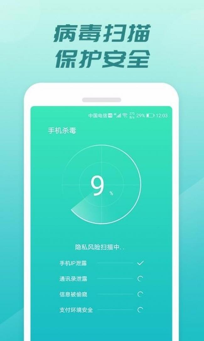 2、全面手机杀毒检索,手机杀毒页面给用户提供了手机IP泄露、通讯录泄露以及信息被偷窃等检索内容。