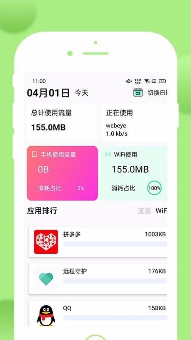 3、展示两种流量使用占比,不仅同时统计了WiFi和流量数据,还展示两种数据占比。