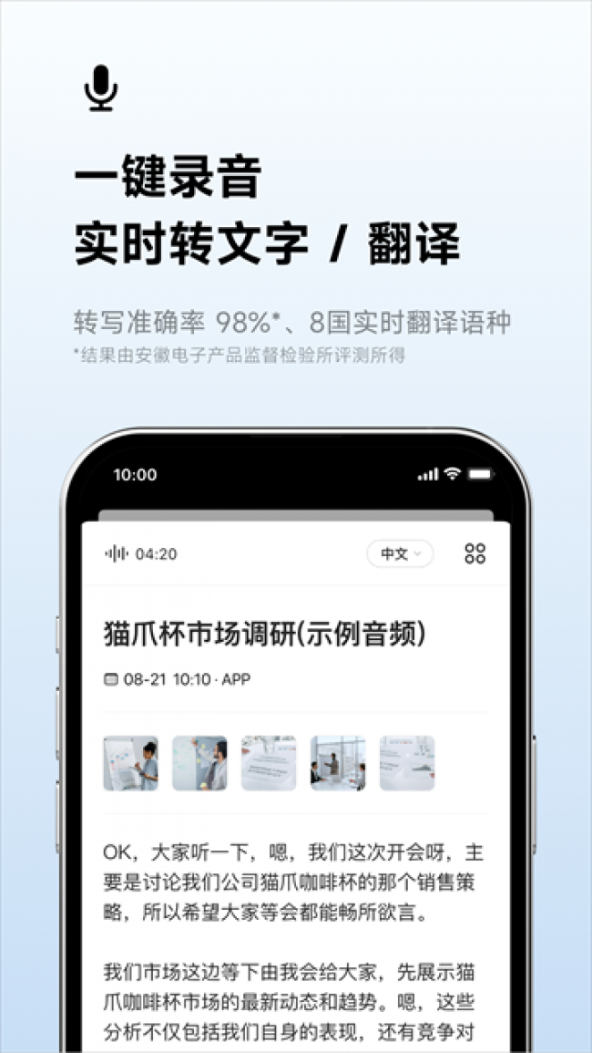 讯飞听见app官方下载是一款非常实用的语音转文字软件,能够支持用户将任何语音文件转换成文字文档,操作也是非常的简单,你只需要将需要转换的语音导入到其中就可以为你进行快速的转换,只需要几分钟就可以将所有的内容转换成功,并且还可以实现边录音边转化,实时的将对方说的话语转换成文字内容并进行高效的编辑,满足用户在不同场景下的使用需求,同时其中还具备了翻译功能,包含了多国语言,让用户可以更加清楚的知道对方说的什么内容,而且转换的准确率也是非常的高,转换完成的文档还可以通过多种格式导出,方便用户随时使用。喜欢的伙伴们快来下载试试吧。