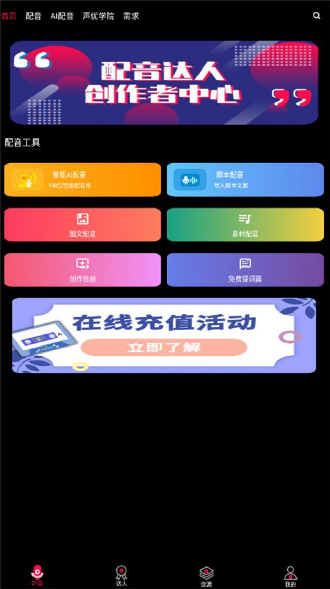 1、应用中拥有大量的配音音频,用户可以在线任意选择使用。