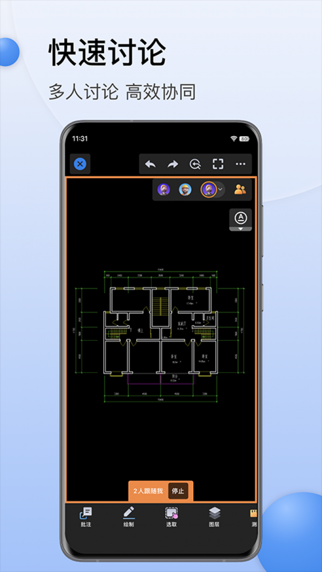 CAD迷你看图app下载是一款非常专业的CAD图纸查看软件,专门为工程设计、施工管理以及相关从业人员提供更优质的看图服务,其中在图纸加载速度和现实精度上表现的非常稳定,让你可以快查看需要查看的设计图纸,并且其中还能够为你提供图层管理、智能测距、简单标注以及编辑功能,能够满足用户日常核对尺寸、确认结构构造位置等多种需求,同时还可以在这里进行多人协同办公,可以同时容纳多个端口接入,共同讨论和修改图纸,有效的增加了用户工作的效率,而且所有的内容都可以多端口同步,一键就可以进行分享发送,极大节省了沟通的成本。喜欢的伙伴们快来下载试试吧。