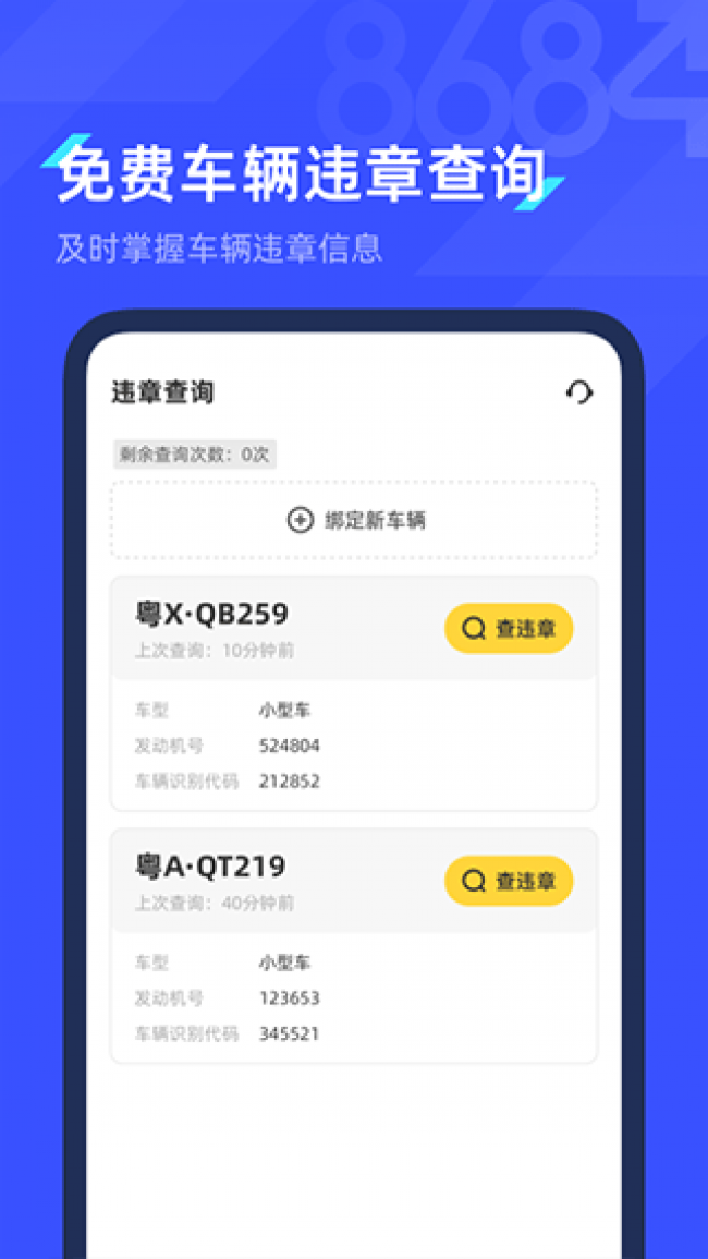 8684查违章app下载是一款非常实用的车辆违章查询软件,能够有效的帮助用户查询自身车辆的违章信息,界面设计简洁明了,操作非常简单,只需要将自己的车牌号输入到其中就可以快速绑定车辆,实时的对违章记录进行查看,并且还能够为你提供历史违章记录查询,所有的违章信息都可以在上面进行查看,而且还可以为你提供代办、罚单代缴等多种实用的车务服务,让你不需要亲自动手就可以帮助你完成各种事项,为用户节省了大量的时间和精力,同时还可以通过它来查询周围的加油站、停车场以及预约洗车服务等,满足用户多种车辆服务,更好的管理自己的汽车。喜欢的伙伴们快来下载试试吧。