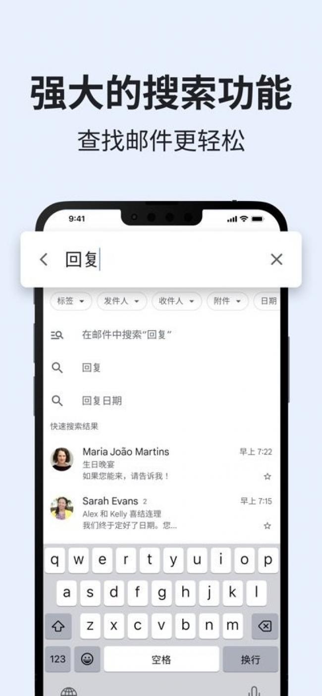 2、通过即时结果、键入预测和拼写建议更快地搜索您的邮件;