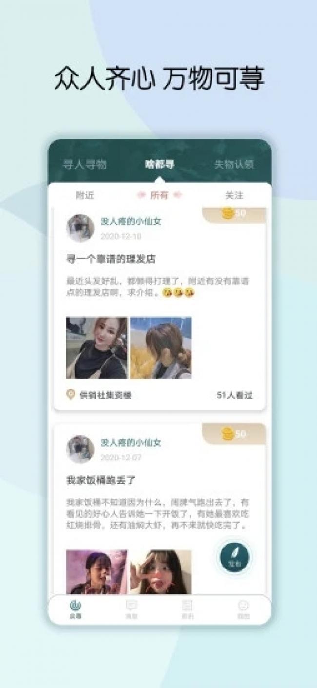 众荨app下载是一款非常实用的寻物软件,通过它可以帮助用户寻人寻物,在这里可以快速帮助你寻找到丢失的物品,为用户提供最优质的寻物服务,你可以在其中发布寻物贴子,通过平台会自动帮你推广出去,可以让更多的人可以了解到寻物寻人启事的详细情况,让方圆十公里的用户手机上都可以显示你的信息,让大家一起帮助你进行寻找,正所谓人多力量大,通过人群的力量可以快速帮助你找寻到丢失的东西,并且平台还会进行一下简单的讲解,带动大家寻到的积极性,同时也可以在其中收到其他人的寻物寻人启事,让大家一起互帮互助,变得更加美好。喜欢的伙伴们快来下载试试吧。