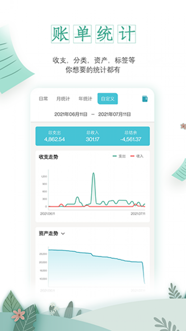 3、月、年、自定义周期的收支统计、资产走势、分类统计、标签统计、预算统计。