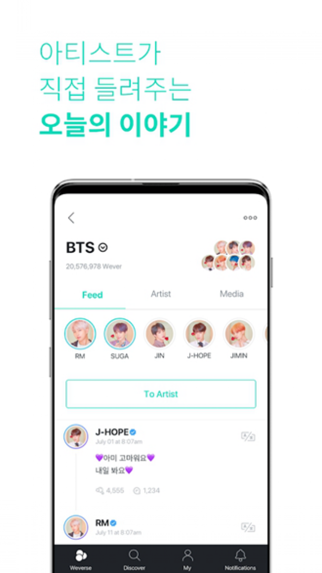 weverse最新版本下载是一款专为喜欢韩星粉丝打造的高质量追星服务平台,在这里您可以关注各种韩星,韩国的知名偶像,无论是男团还是女团都可以满足不同用户的追星需求,粉丝们通过软件就可以跟旗下的艺人进行互动,艺人跟平台进行了合作哦,关注喜欢的明星,了解他们最新的动态信息,无论是演唱会还是购买明星的周边,T恤等,它支持多种语言,便于不同国家地区的用户可以更好交流互动,在这里找到志同道合的好友,一起追喜欢的明星,通过直播或者是私信与喜欢的偶像进行互动,所有的功能都是免费的,没有广告打扰哦,喜欢的伙伴们快来下载试试吧。