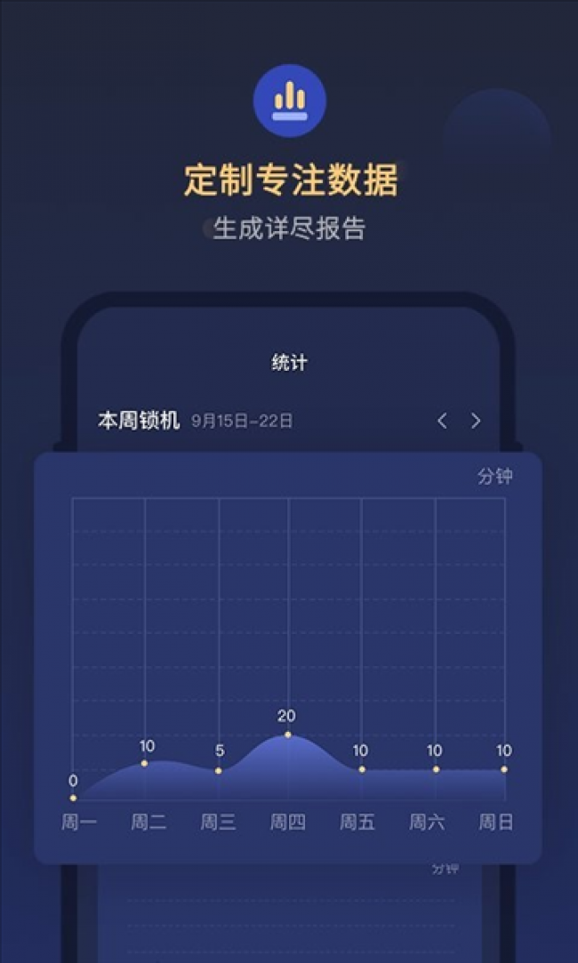 3、在每次用户使用后本产品会为用户定制专属报告,自动生成图表,人性化分析本次锁机情况,帮助用户养成良好的生活习惯。