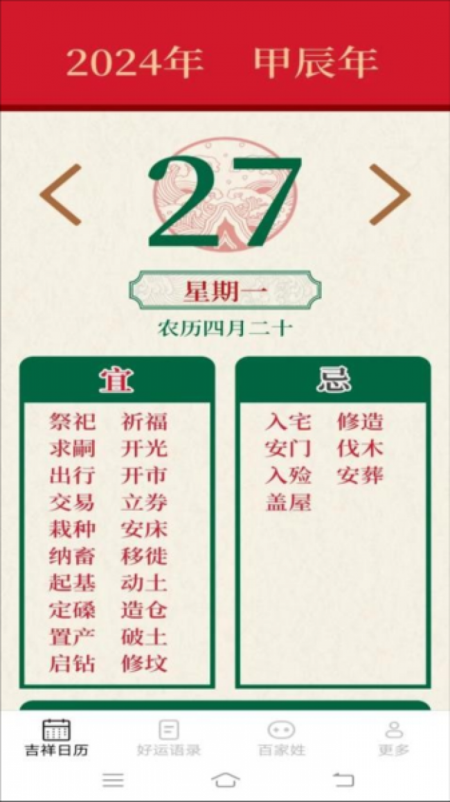 吉祥如意来app下载是一款吉祥和好运查询工具,其中汇聚了吉祥日历、好运语录以及百家姓等诸多服务为一体,致力于为用户提供更加便利的查询好日子和语录的服务,可以根据自己的需求,自行在线查看日志,了解各种宜忌情况,方便于用户更加顺利的办事,享受到更加美好的生活,其中还有诸多好运语录可以畅享阅览,并且还可以复制分享到朋友圈或者社交圈当中,从而可以影响到更多的人积极生活,同时其中还能够提供百家姓查询服务,可以在这里查询到姓氏的起源,了解更多的姓氏文化,从而增加家族的归属感,为你带来更多有趣的查询工具。喜欢的伙伴们快来下载试试吧。