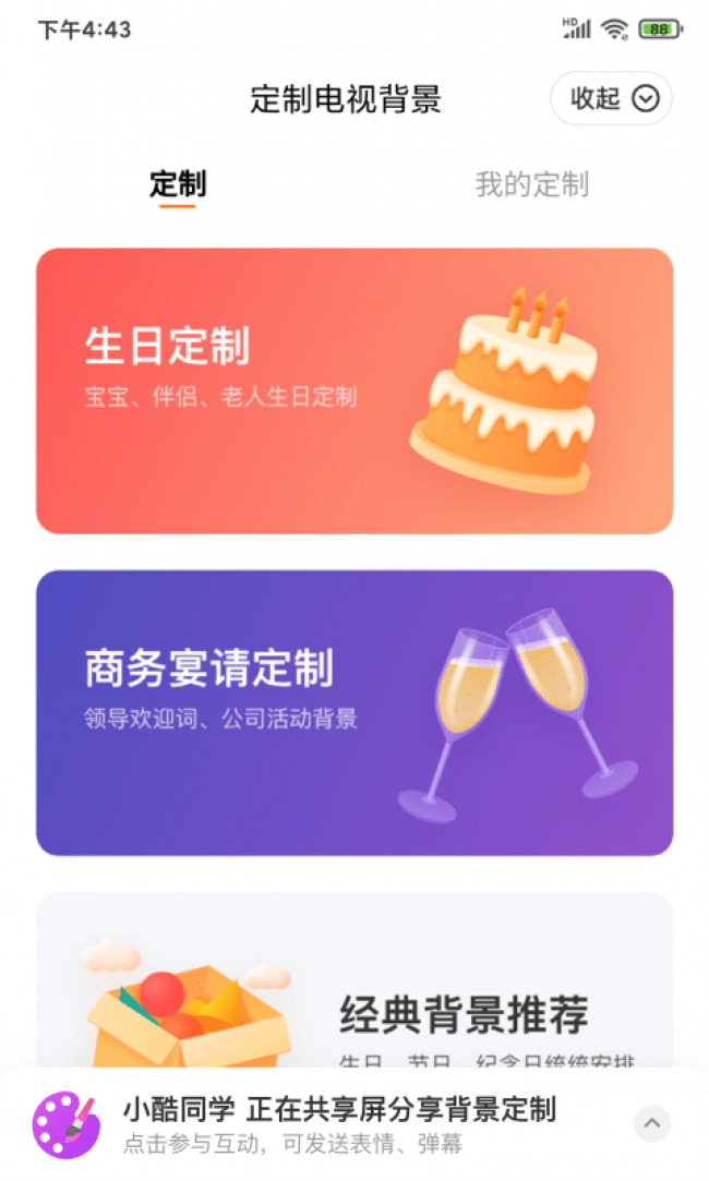 3、在线可以定制电视背景,比如生活定制、商务宴请定制等,自动保存用户的定制记录。