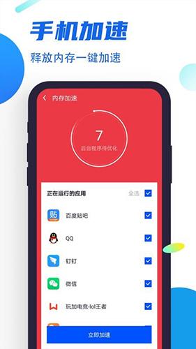 飞速清理管家app下载是一款全能性手机智能优化软件,能够为你高效的解决手机卡顿以及内存不足等问题,通过深度扫描手机当中的各种类型文件垃圾并进行高效的清理,为你的手机释放出大量的内存空间,有效的提升手机运行速度,并且还可以通过它随时监测手机CPU的温度,温度过高的时候及时进行降温,有效的保护了手机硬件不会受到损伤,而且还可以为你提供微信专清功能,可以深度扫描你的微信缓存,将各种图片、视频以及聊天记录等内容展现出来,用户可以选择不需要的进行清理,节省大量的内存空间,让你的手机变得前所未有的干净。喜欢的伙伴们快来下载试试吧。