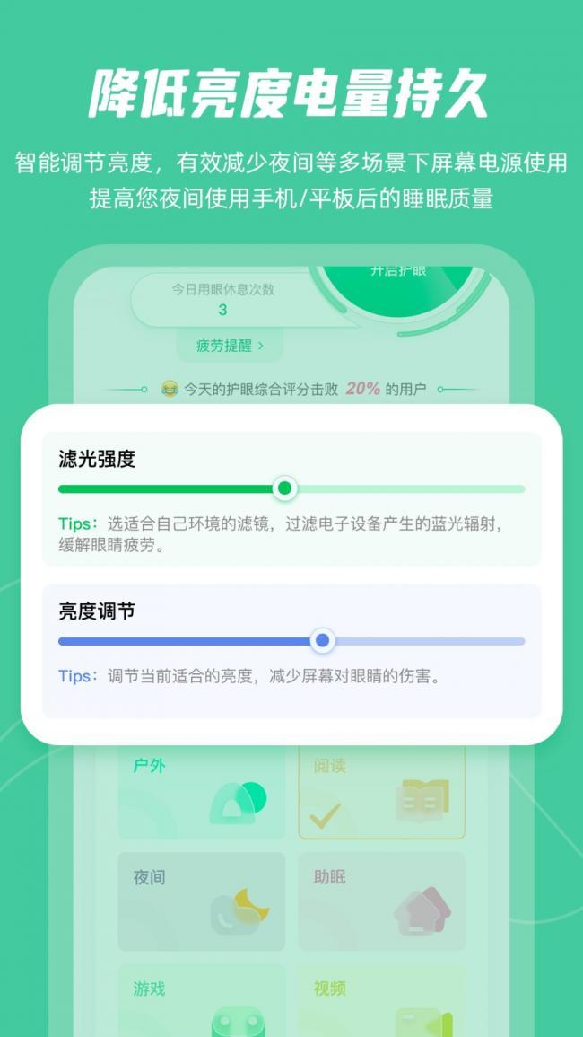 3、提供夜间使用提醒功能,引导用户合理使用手机,注意眼部休息。