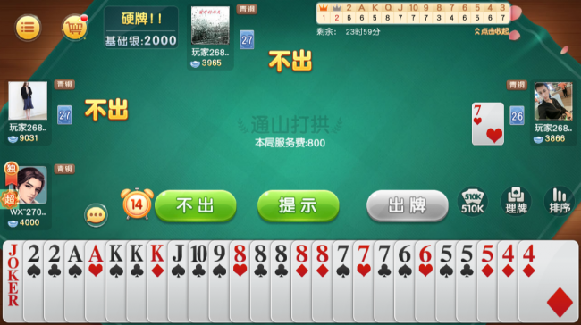 2.抓分:5=5分,10、K=10分。玩家出的牌,其他三家都选择不出,则获得桌面分。