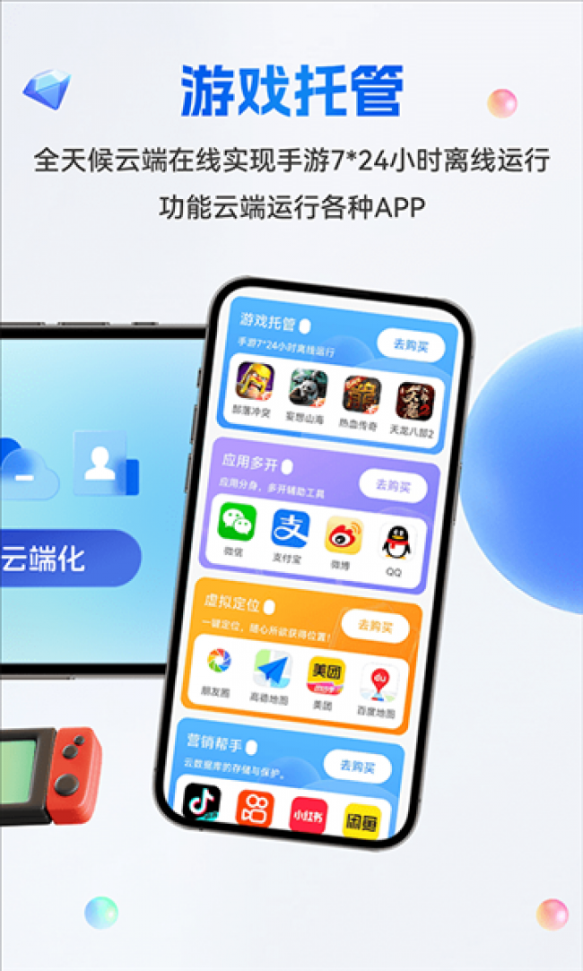 八通云手机app下载是一款非常实用的云手机服务平台,用户可以通过它来进行对游戏的挂机操作,其中能够为用户提供24小时托管服务,能够帮助用户自动进行在线收集资源以及打怪升级等操作,让你可以遥遥领先其他的玩家,用户也可以有跟多的时间去做其他的事情,非常的方便,并且还可以在同一部手机上控制多个账号同时进行挂机,哪怕是手机没电关机也不用担心游戏会退出,从而让你可以获取更好的游戏体验,同时还可以为你提供数据加密服务,确保你在使用云手机的时候不会有任何的信息泄露,确保用户的个人隐私和游戏账号的安全性。喜欢的伙伴们快来下载试试吧。