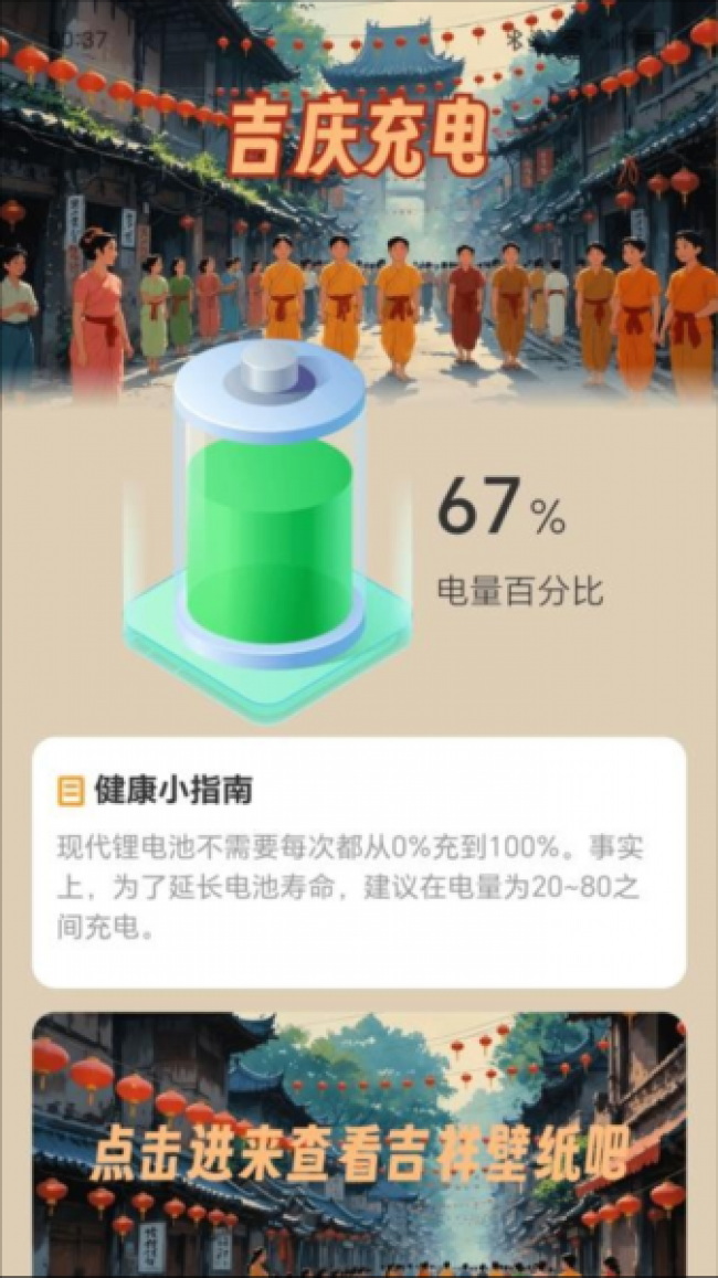 吉庆充电app下载是一款非常实用的手机充电管理软件,通过它可以帮助用户更快更科学的进行充电,用户可以随时查看手机电池的健康状态,帮助用户轻松进行电池的深度优化,能够极大程度上提高电池使用寿命,让所有用户进行电池优化管理变得更加有效率,并且其中还可以为你提供丰富的充电壁纸可以选择,用户可以根据自己的喜好选择不同风格的主题壁纸,为你带来更好的充电体验,而且除了充电管理之外还可以为你提供节气提醒,让你在充电的时候可以学习到传统文化知识,在充电的过程当中也不会无聊,可以拓展自己的知识面积学习更多传统文化。喜欢的伙伴们快来下载试试吧。
