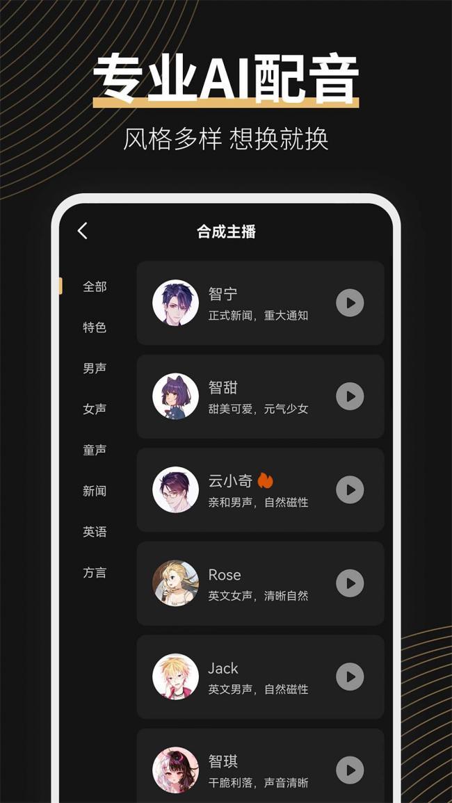 广告配音大师app下载是一款功能强大的文字转语音软件,能够帮助用户将各种文字内容转换成不同的语音播放,操作非常的简单,只需要将文字输入到其中就可以快速转换成自然流畅的语音,并且还可以为你提供多种AI配音风格,满足用户在不同场景下的需求,用户可以根据自己的喜好自由切换不同主播的声音,而且还可以支持中英文双语配音,让你可以更好的利用它完成各种配音需求,其中还可以为你提供丰富多样的优质背景音乐可以选择,用户还可以导入本地音乐进行个性化定制,同时还可以为你提供丰富的配音模版,让你轻松打造专业的音频作品。喜欢的伙伴们快来下载试试吧。