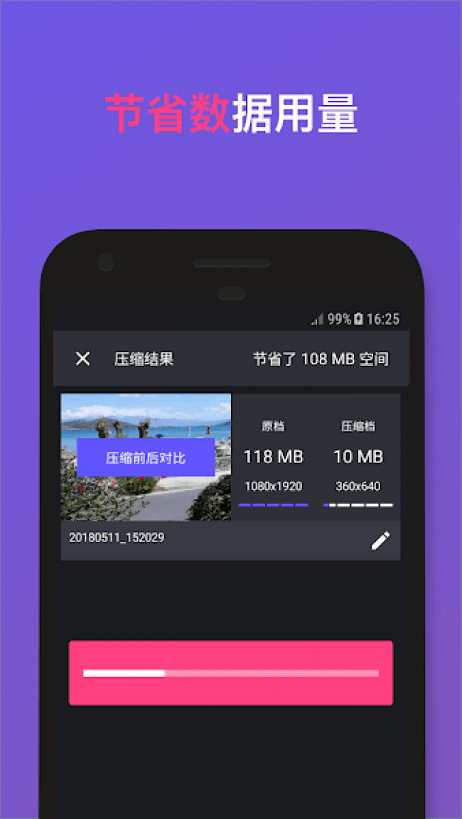 熊猫视频压缩器最新版下载安装是一款非常便捷的视频处理软件,能够有效的帮助用户解决视频存放的问题,通过它可以将手机当中所有的视频全部进行压缩处理,在压缩的同时不会损伤视频的画质,始终可以保持到最佳的画质,快速将比较大的视频文件进行缩小。节省了手机的大量储存空间,同时上传到社交平台上更加的流畅,还可以支持多种常见的格式进行压缩,操作非常简单,只需要简单的几个步骤就可以完成压缩操作,其中还可以为你提供格式转换和一键分享功能,让你能够随时处理和分享你的视频作品,而且所有功能都是免费使用,非常的方便。喜欢的伙伴们快来下载试试吧。