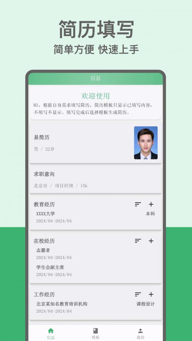 1、易简历app下载操作流程简单,可以迅速掌握使用方法。