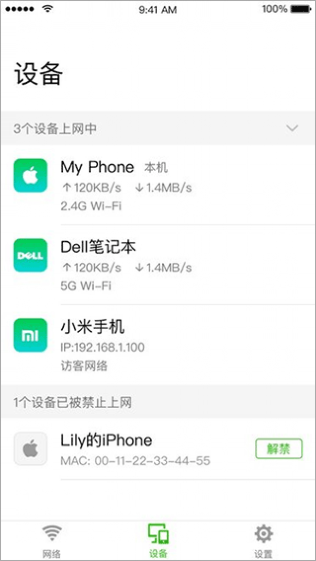 2、支持对已连接设备进行监控和管理,包括一键禁用、限制上网带宽等功能,有效防止陌生设备蹭网。