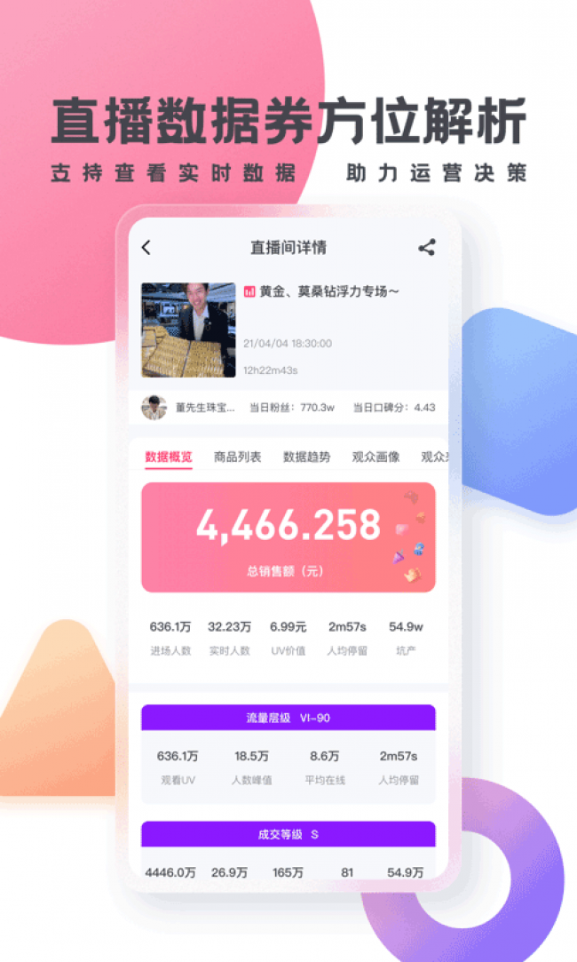 1、支持搜索商品,查看爆款商品合作主播信息,提供销量数据等。