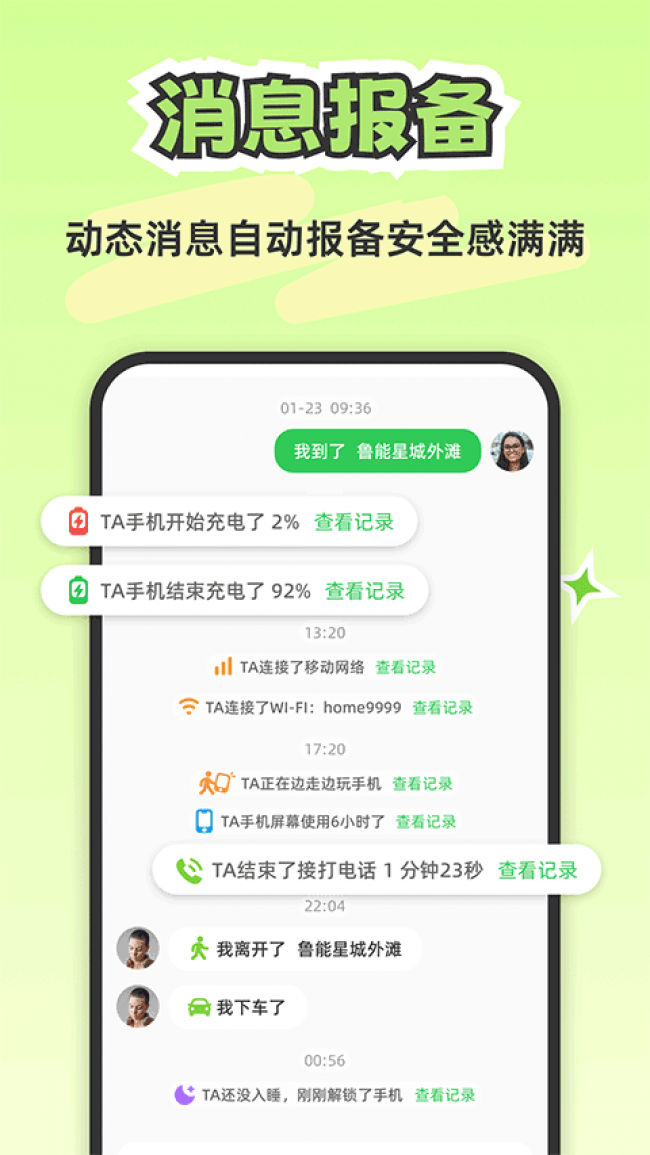 3、当对方上车、下车或离开、到达任意地点时,自动发送报备信息。